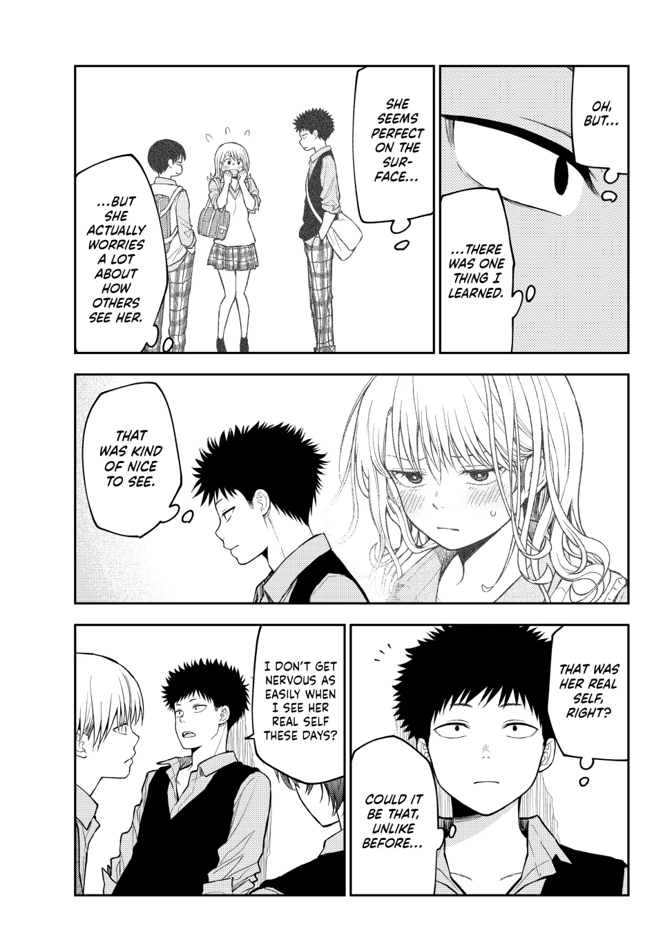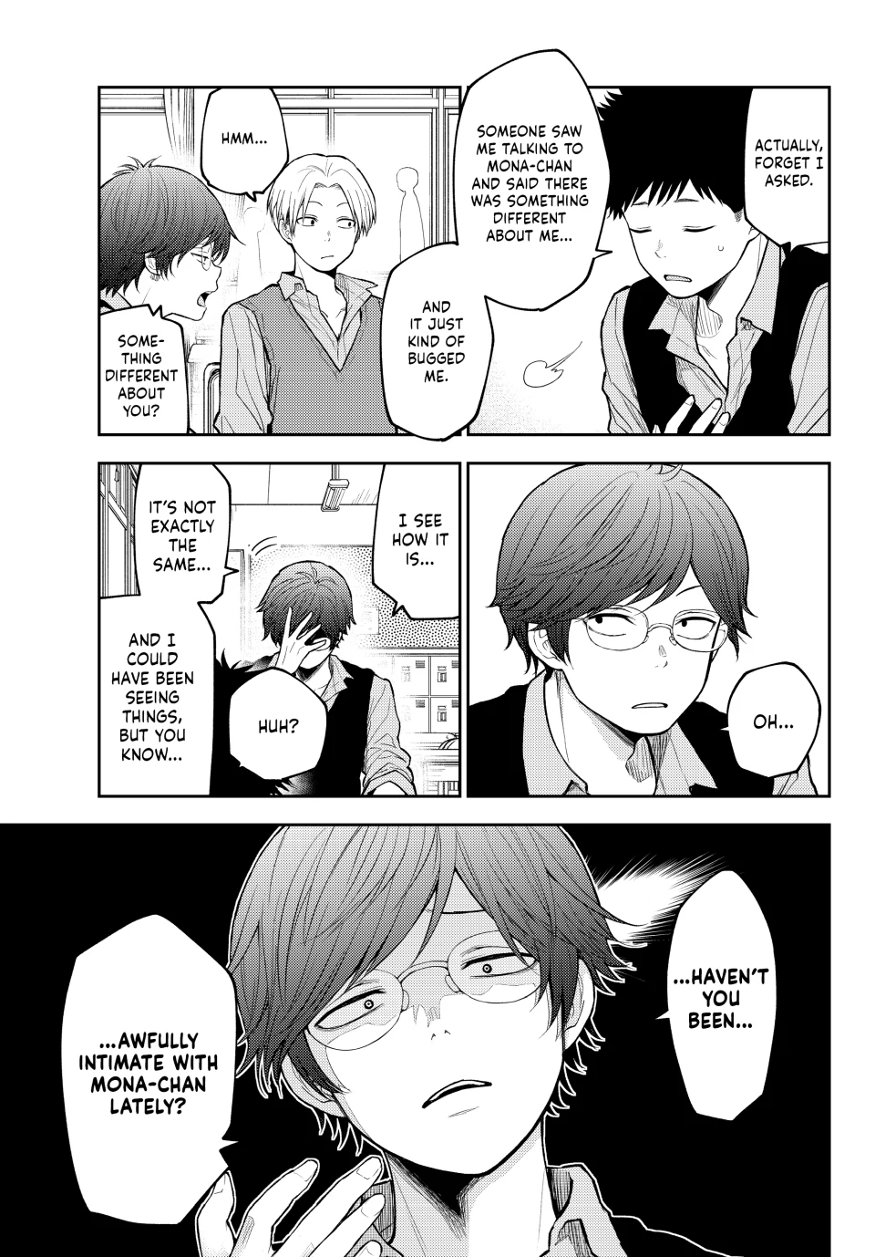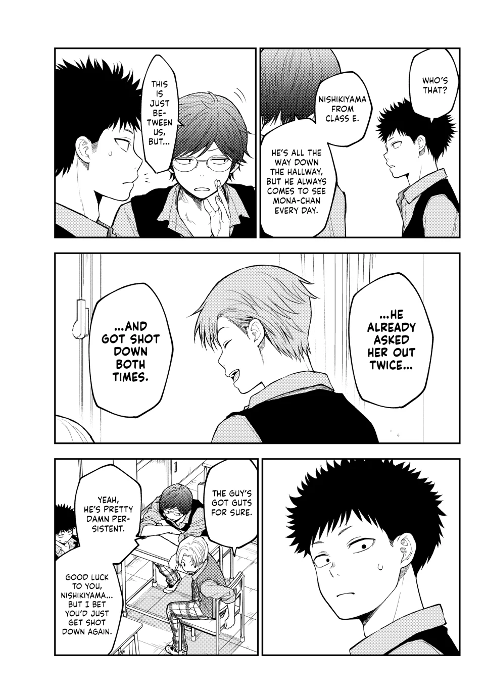 La verdad es que siento que a la autora de nada le sirve tener un editor, es decir, se supone que Mona-chan tiene 2 rivales en el amor declaradas y a parte hay 2 mujeres de las cuales no sabe nada y no entiende sus intenciones con Kuroiwa (Shinagawa y Karin) y en el caso de Kuroiwa pues, él realmente no entiende nada sobre el amor o las intenciones de las mujeres que lo rodean por lo que agregar uno mas rivales tendria sentido si él de verdad sintiera algo ya definido por ella pero, no es el caso. El equivalente a lo anterior seria como tirar un anzuelo a un rio, lago o mar creyendo que vas a pescar “porque hay agua” y eso automáticamente te hace creer que hay peces o que van a ir a ti asi sin mas, o sea, no lo sabes. Ahora bien, siento que ésta situacion es demasiado cliche y aunque podria servir para “darle un empujon a Kuroiwa”, lo cierto es que ese tiempo invertido en rivales sin sentido para Kuroiwa deberia ser invertido en desarrollo para Shounan pero principalmente Tomo a quien casi parece que no esta verdaderamente interesada en Kuroiwa e.e … PD: Siento que Kuroiwa va a hacer que Mona-chan eventualmente deje de intentar “ser tan linda” o perfecta frente a otros o incluso le va a pedir que “no se oculte y sea ella misma cuando esté junto a él”, pero bueno, toca esperar u.u….