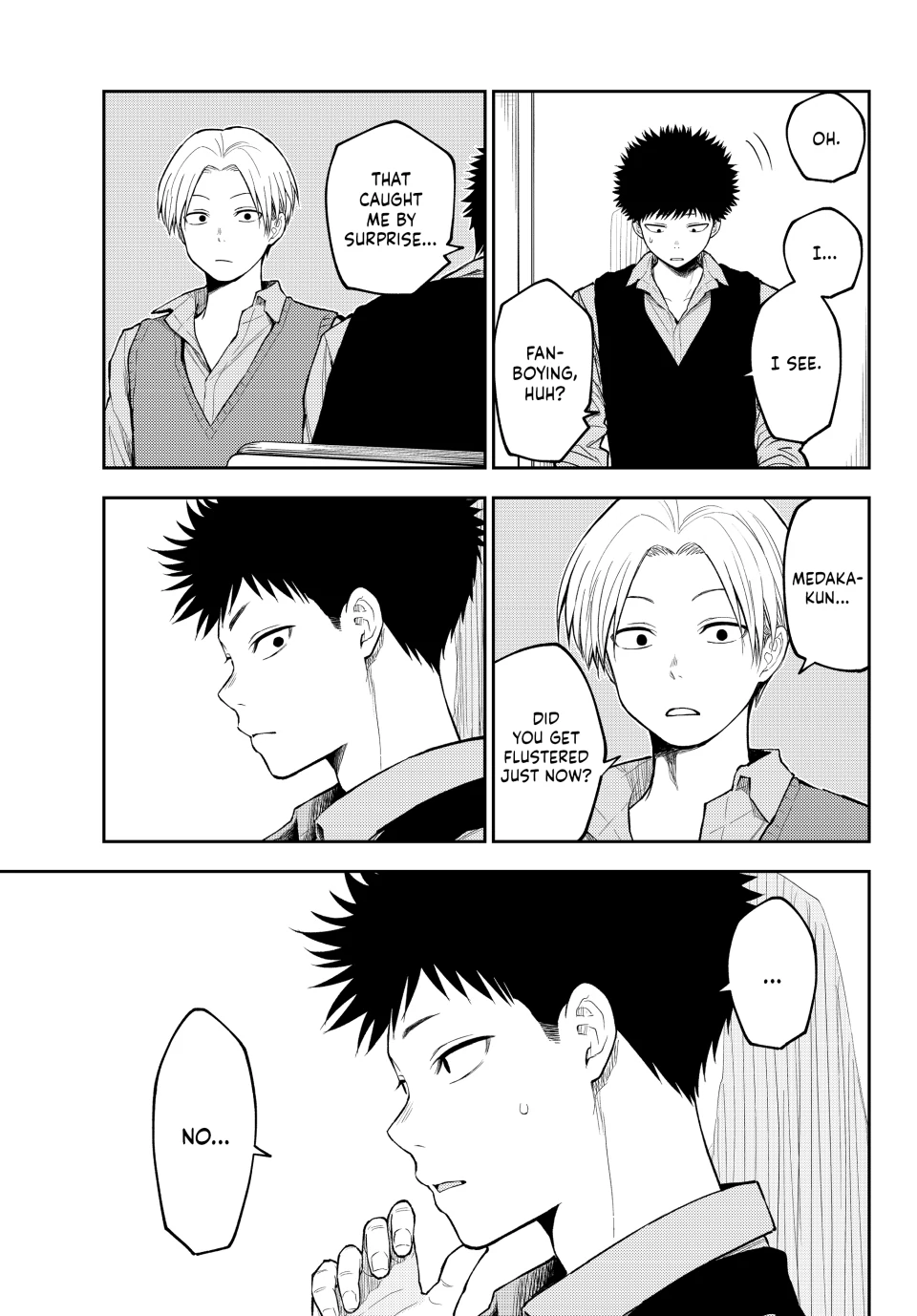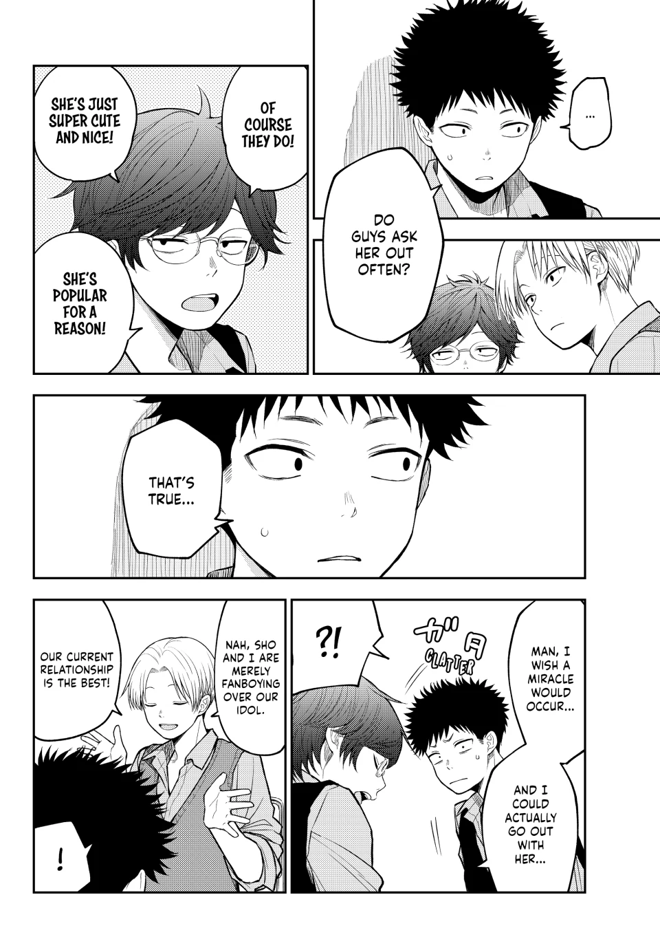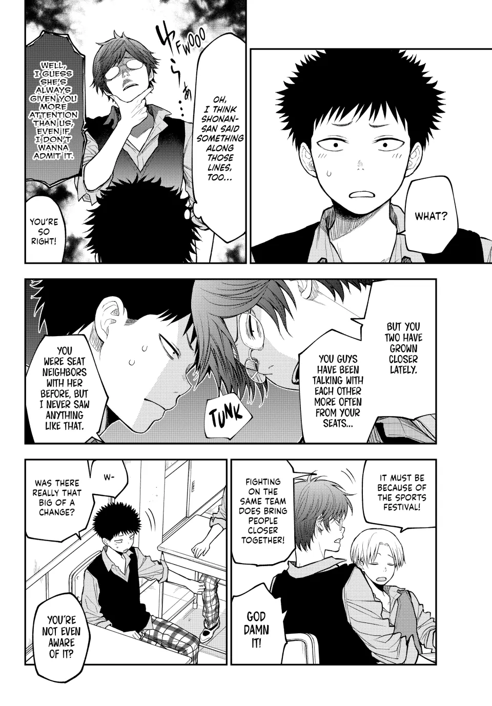La verdad es que siento que a la autora de nada le sirve tener un editor, es decir, se supone que Mona-chan tiene 2 rivales en el amor declaradas y a parte hay 2 mujeres de las cuales no sabe nada y no entiende sus intenciones con Kuroiwa (Shinagawa y Karin) y en el caso de Kuroiwa pues, él realmente no entiende nada sobre el amor o las intenciones de las mujeres que lo rodean por lo que agregar uno mas rivales tendria sentido si él de verdad sintiera algo ya definido por ella pero, no es el caso. El equivalente a lo anterior seria como tirar un anzuelo a un rio, lago o mar creyendo que vas a pescar “porque hay agua” y eso automáticamente te hace creer que hay peces o que van a ir a ti asi sin mas, o sea, no lo sabes. Ahora bien, siento que ésta situacion es demasiado cliche y aunque podria servir para “darle un empujon a Kuroiwa”, lo cierto es que ese tiempo invertido en rivales sin sentido para Kuroiwa deberia ser invertido en desarrollo para Shounan pero principalmente Tomo a quien casi parece que no esta verdaderamente interesada en Kuroiwa e.e … PD: Siento que Kuroiwa va a hacer que Mona-chan eventualmente deje de intentar “ser tan linda” o perfecta frente a otros o incluso le va a pedir que “no se oculte y sea ella misma cuando esté junto a él”, pero bueno, toca esperar u.u….