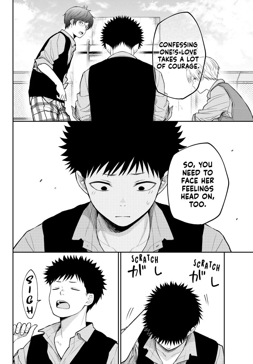 Muchas cosas qué decir tanto para bien como para mal. Para empezar los sucesos de éste cap suceden un dia despues del beso publico de Shounan, lo cual debio haber sido suficiente tiempo para esparcir los rumores sobre que “una chica beso a un senpai en la entrada de la escuela”, lo cual no pasó y no tiene mucho sentido pues no es comun que los japoneses se besen en publico y la polemica aumenta si pensamos en que Kuroiwa es un senpai de 3er año, por lo que deberia ser un buen chisme para muchos ya que fue un beso hecho por una kouhai y no cualquiera sino de la estrella del club de baloncesto. Ahora bien, digamos que “no era tan importante”, en lo personal me sorprende que ni Mona ni Tomo se enteraran e incluso Karin o Mao que son de primer año y seria mas facil para ellos enterarse ya que Mao sigue muy de cerca a Shounan y Karin aun sigue algo obsesionada con Kuroiwa. Por otro lado hay que ver la reaccion de Kido y Kobayakawa que, si bien ambos son unos idiotas, se supone que Kido habia llegado a un punto en el que “habia madurado” y el unico inmaduro era el tipo de lentes y aqui volvemos a ver la faceta mas mediocre de Kiba y que no tiene mucho sentido a éstas alturas sin mencionar que él no deberia ponerse celoso sabiendo que él ha tenido varias novias y lo mas probable es que las haya besado o algo mas y en el caso de Kobayakawa, él simplemente no tiene la madurez para tener una relacion por lo que las respuestas de ambos hacia Kuroiwa debieron haber sido bastante diferentes, por ejemplo Kiba debio mantener su perfil de gigolo superficial y simplemente decirle que “ya es muy tarde para hablar de preceptos, ademas si ella se te confeso es porque lo sabe y no le importa mas que tu opinion de ella” y Kobayakawa debio haber dicho algo como “eres un idiota, no sé cómo pude haber tenido envidia de ti si no sabes aprovechar las oportunidades. Si vas a seguir actuando como un idiota al menos aprovecha la oportunidad para ser sincero con ella y darle la oportunidad a alguien para salir con ella”; asi es como debio y me hubiera gustado que la autora escribiera a sus personajes en éste cap. Con respecto a Shounan, no le encuentro mucho sentido que haya estado dormida y/o que Minami lo permitiera pues se supone que ya era el final de clases y por ende lo mas normal es que estuviera despierta y si la autora iba a ir con eso pues, entonces debio haber hecho que Minami le dijera a Kuroiwa algo como “dale una oportunidad senpai”. Ya por ultimo, personalmente hubiera preferido un millon de veces mas que Kuroiwa le fuera a pedir ayuda a Sunagawa pues ya en otros casos hemos visto que él le pide ayuda o en su defecto, ella trata de aconsejarlo en temas relacionados con el romance… pero bueno, es lo que hay u.u…