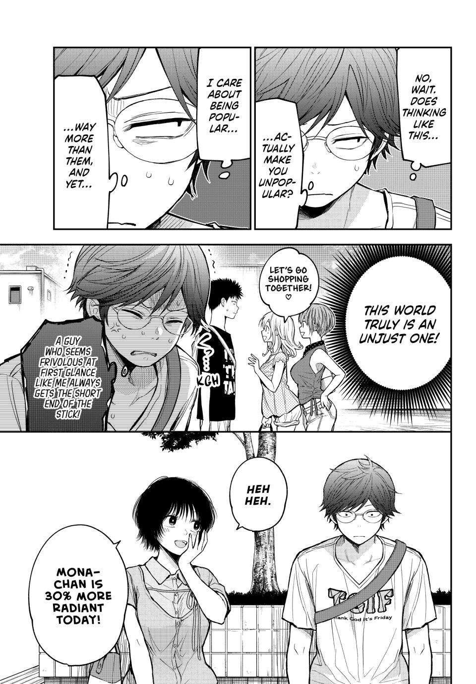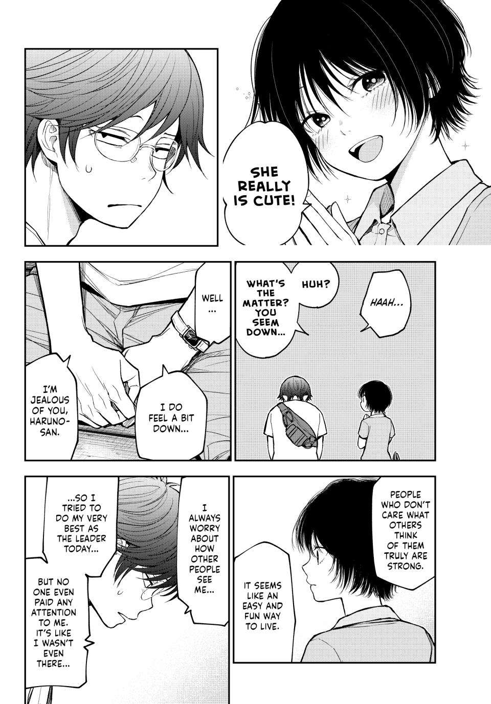 Aqui hay que hacer dos observaciones bastante importantes e incluso “trascendentes” si es que se llega a algo mas. veran, desde hace un tiempo, Haruno ha venido a ser algo asi como “la mascota” de la historia, la mascota del salon de clases, la mascota del grupo de chicas y la mascota del grupo de Mona-Kuroiwa, es decir, un personaje que aporta poco o nada para la trama o la historia en general y que de alguna manera su mayor virtud es o puede ser su belleza y ternura, su torpeza o personalidad despreocupada o incluso algo mas simplon como tener pechos grandes, ser glotona o ser muy animada (genki girl) y si alguien para éste punto idenfico a un monton de personajes principales con esas caracteristicas pues dejenme decirles que, en efecto, todas esas caracteristicas son cliche y funcionan para construir personajes pero, el problema o detalle es que en ésta historia en especifico, la autora no le ha dado tanto protagonismo o importancia a Haruno, lo cual ha dejado una huella negativa al personaje al punto de volvera inncesaria y que la autora facilmente la pudo haber eliminado al decir que tenia que mudarse por el trabajo de sus padres, pero bueno. Con lo anterior quiero decir que si Haruno no es y nunca ha sido importante pues, Kobayakawa es incluso menos importante o necesario que ella y por razones que desconozco y no entiendo, la autora le vuelve a dar escena a ambos y que vuelve a enceder las alarmas para un posible ship en el futuro ya que ambos son inutiles e inncesarios en la narrativa y desarrollo de la trama principal y ambos son los personajes menos importantes para su equivalente en protagonista (Mona-Kuroiwa) y el problema sigue siendo el mismo, cómo por qué desperdiciar caps en ellos dos???; por qué???, digo, si nos ponemos a pensar, Minami y Kido tienen una mayor justificacion por su personalidad, lore e influencia en los protagonistas pero Haruno y Kobayakwa son basura. Ahora bien, todo ésto que menciono es poco si nos ponemos a pensar que la autora de querer o creer que “ésto podria funcionar”, no seria dificil imaginar que volvera a meter mas caps innecesarios con éste par de inutiles y si eso pasa entonces el desarrollo de la trama principal incluso podria retrasarse aun mas, o sea, ya vamos por el cap 211 y aun nos falta darle construccion a Mao, Karin e incluso a Shinagawa :S….